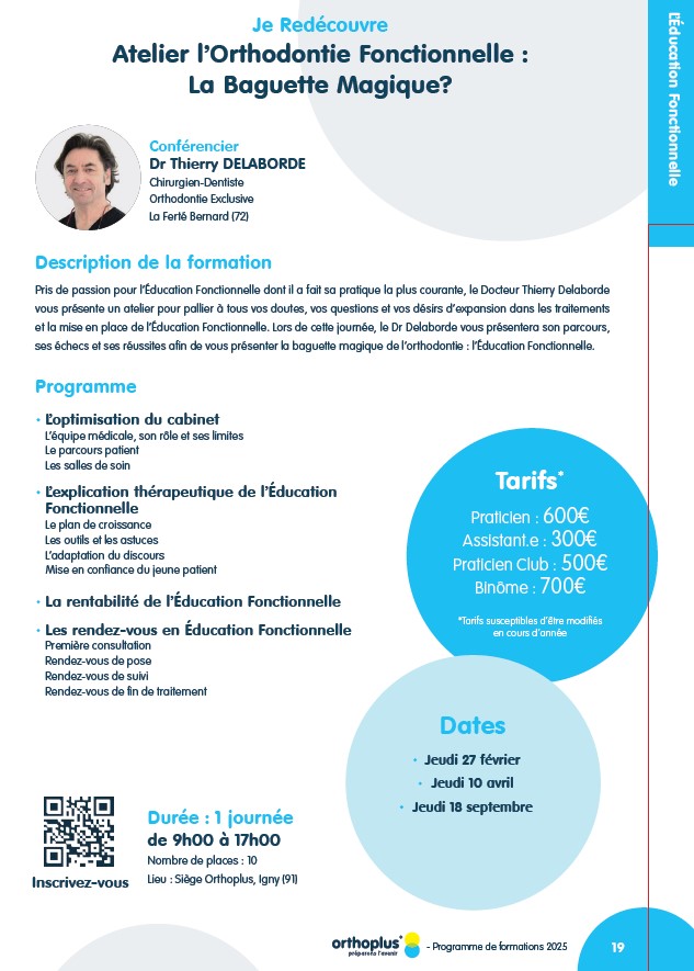 Lors de cette journée, le Dr Delaborde vous présentera son parcours, ses échecs et ses réussites afin de vous présenter la baguette magique de l’orthodontie : l’Éducation Fonctionnelle.
